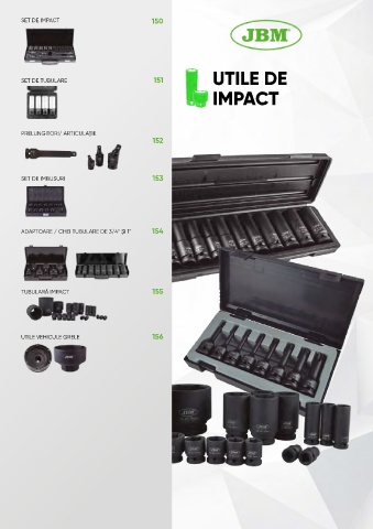 SET DE IMPACT 150 UTILE DE SET DE TUBULARE 151 IMPACT PRELUNGITORI/ ARTICULAȚIE 152 SET DE IMBUSURI 153 ADAPTOARE / CHEI TUBULARE DE 3/4” ȘI 1” 154 TUBULARĂ IMPACT 155 UTILE VEHICULE GRELE 156