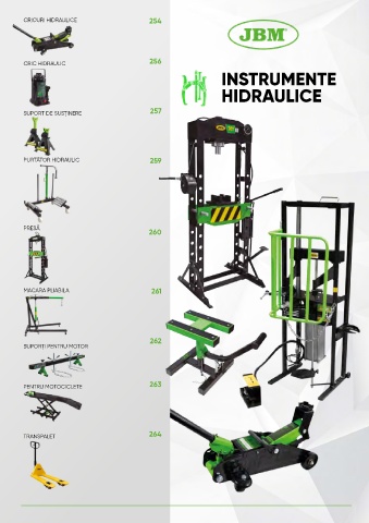 CRICURI HIDRAULICE 254 CRIC HIDRAULIC 256 INSTRUMENTE HIDRAULICE SUPORT DE SUSŢINERE 257 PURTĂTOR HIDRAULIC 259 PRESĂ 260 MACARA PLIABILA 261 262 SUPORŢI PENTRU MOTOR PENTRU MOTOCICLETE 263 TRANSPALET 264