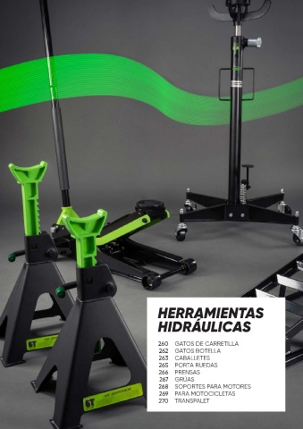 HERRAMIENTAS HIDRÁULICAS 260 GATOS DE CARRETILLA 262 GATOS BOTELLA 263 CABALLETES 265 PORTA RUEDAS 266 PRENSAS 267 GRÚAS 268 SOPORTES PARA MOTORES 269 PARA MOTOCICLETAS 270 TRANSPALET